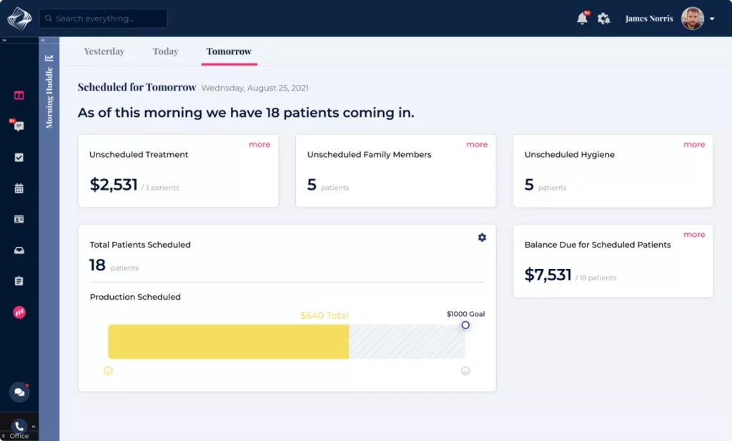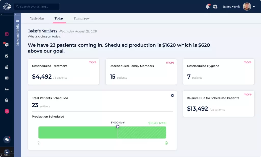 Review the previous day’s collections, take stock of your current assets, and plan for the future. The morning huddle feature organizes data and analytics by day, giving you a clear, organized picture of how to capitalize on your practice.